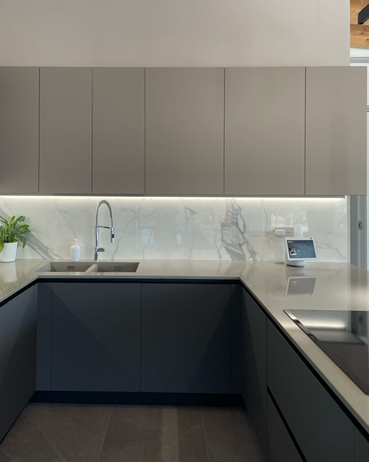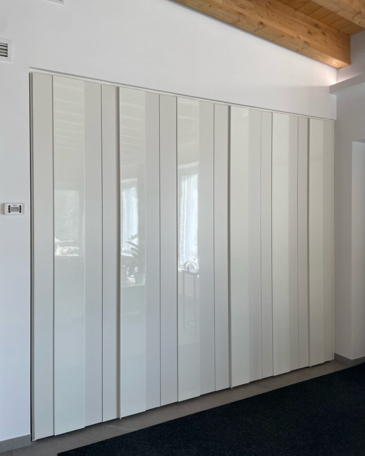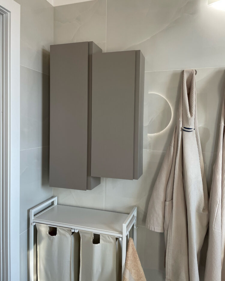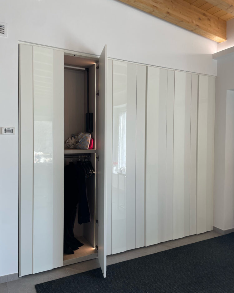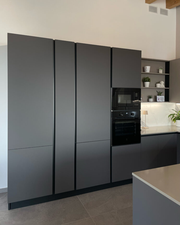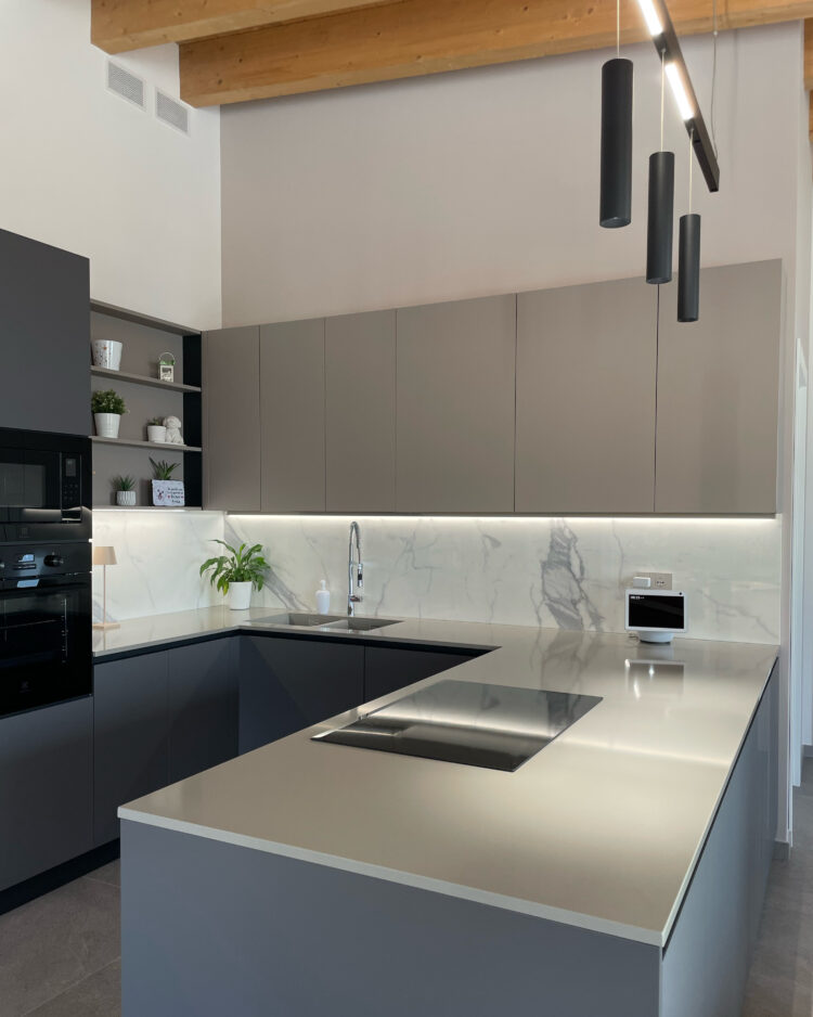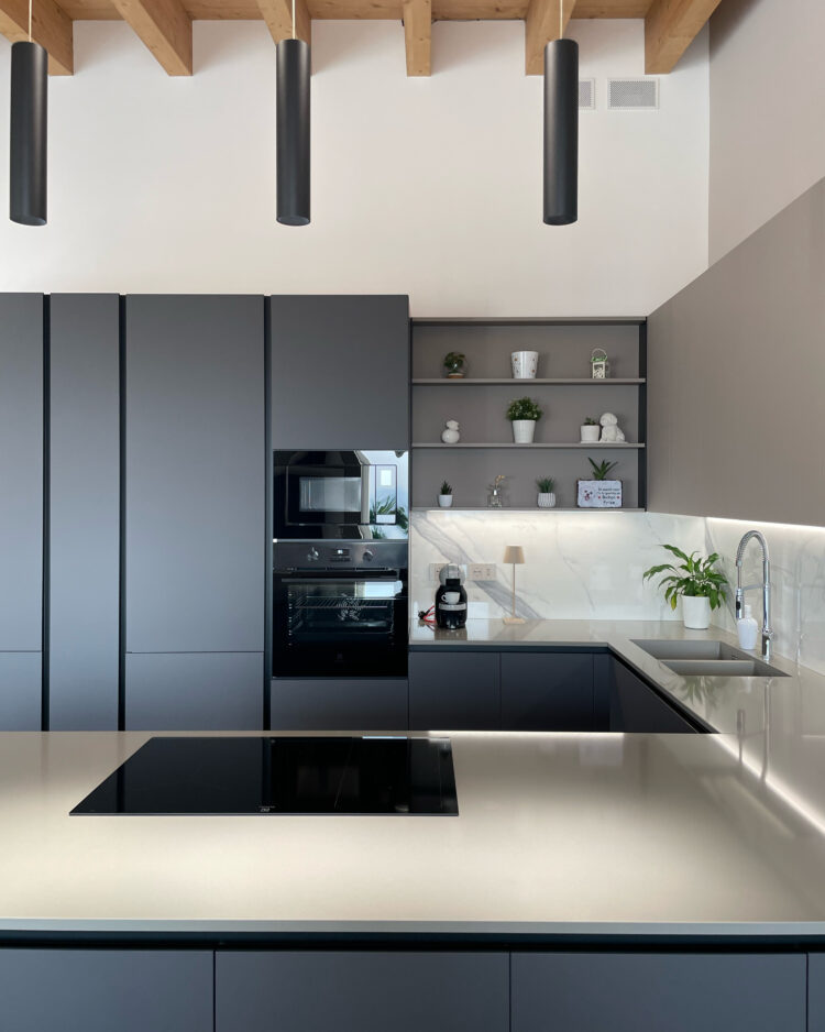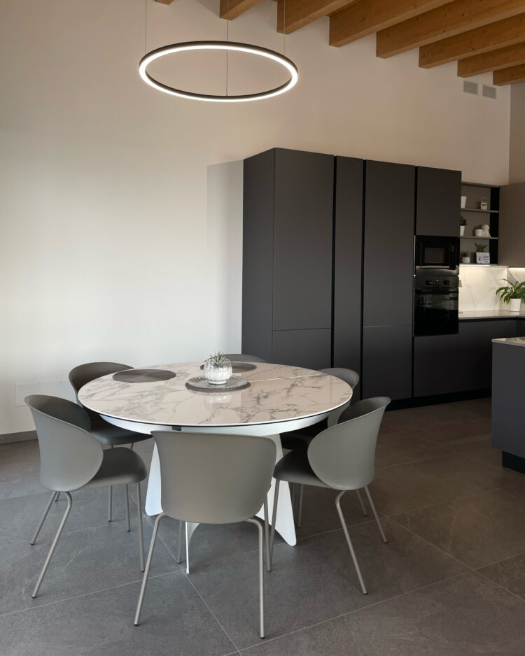 La cucina domina l’ambiente. Il suo contrasto tra colori caldi e freddi è elegantissimo e moderno. Il modello scelto dai clienti è lo Start Time J Soft di Veneta Cucine nelle finiture Grigio Scuro e Marrone. Il tavolo rotondo di Connubia è sinuosamente accostato. A completare la stanza, l’armadio Plissè di Novamobili: neutro, ma dalla originale alternanza di finiture opache e lucide.