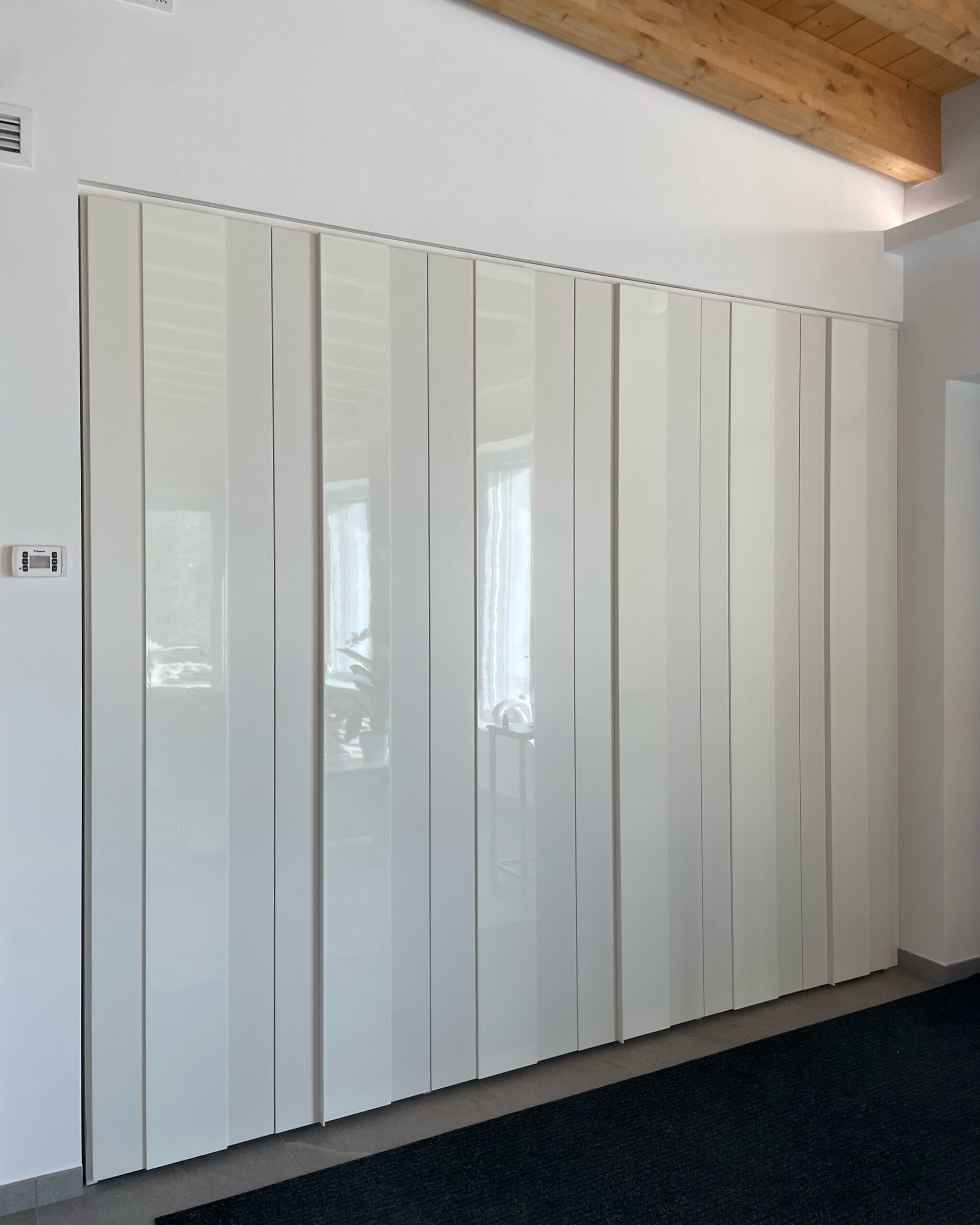 La cucina domina l’ambiente. Il suo contrasto tra colori caldi e freddi è elegantissimo e moderno. Il modello scelto dai clienti è lo Start Time J Soft di Veneta Cucine nelle finiture Grigio Scuro e Marrone. Il tavolo rotondo di Connubia è sinuosamente accostato. A completare la stanza, l’armadio Plissè di Novamobili: neutro, ma dalla originale alternanza di finiture opache e lucide.